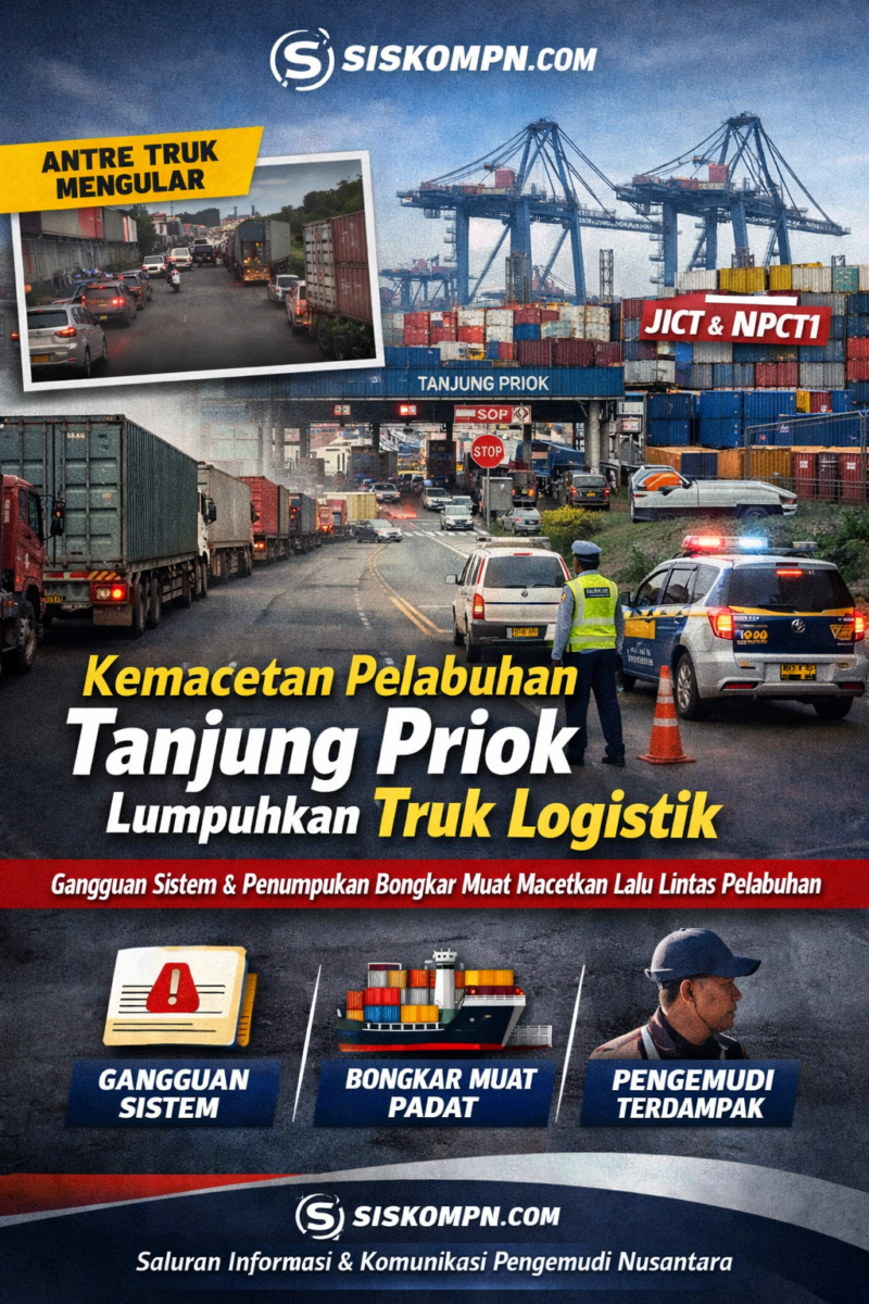SISKOMPN.COM  Jakarta Utara | Kamis, 15 Januari 2026 – Kemacetan pelabuhan Tanjung Priok menyebabkan antrean panjang truk logistik di Jakarta Utara. Kondisi ini terjadi sejak Rabu malam dan berlanjut hingga Kamis siang.