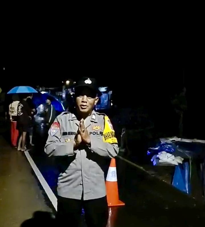 Aiptu Agus Hendra menyampaikan laporan langsung dari lokasi longsor. Ia mengimbau pengendara roda empat agar sementara waktu tidak melintasi jalur tersebut karena kondisi tanah masih labil dan berpotensi terjadi longsor susulan.