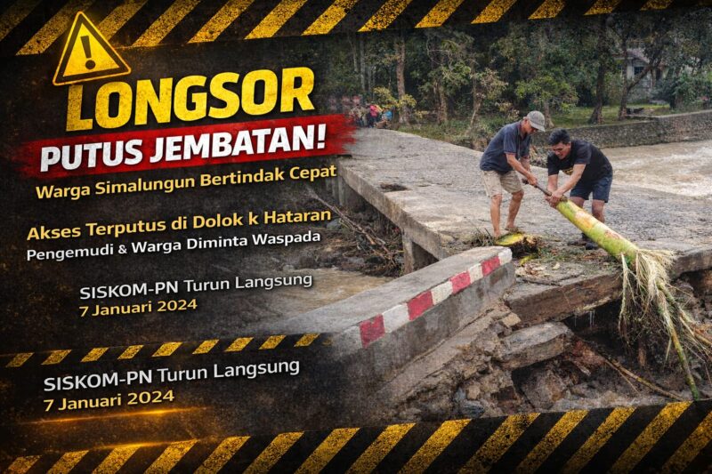 SISKOMPN.COM | Simalungun, 7 Januari 2024 — Longsor Simalungun Huta Sidomulyo terjadi di Kelurahan Dolok Hataran pada dini hari. Peristiwa ini menyebabkan jembatan utama terputus dan menghambat akses warga.